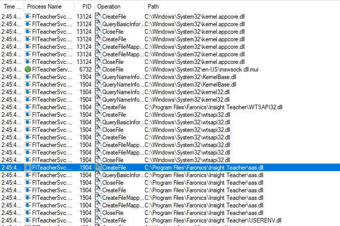The screenshot above shows three instances where FITeacherSVC.exe (which runs as SYSTEM) attempts to load a system DLL from the current working directory rather than the intended directory.