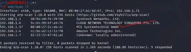 Start network scan in your kali terminal with the help of ARP scan or Netdiscover